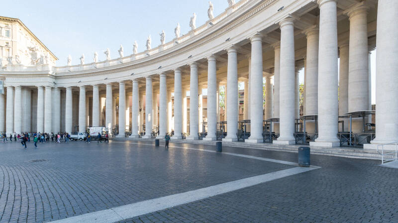 De zuilengang aan de rechterzijde. De zuilengangen beelden de omarming van de kerk uit. Detail van de zuilengang.