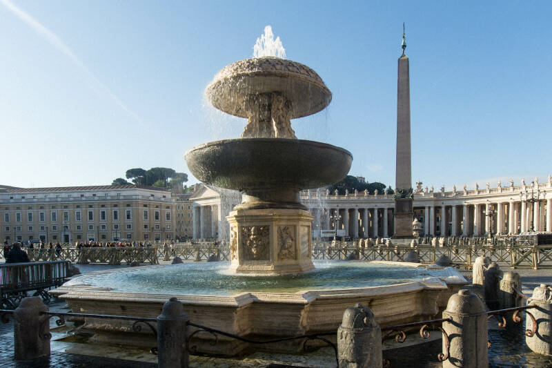 Een van de twee fonteinen op het Sint Pietersplein. Van de obelisk gaat de legende dat een deel van het kruis van Christus in de obelisk is verwerkt.