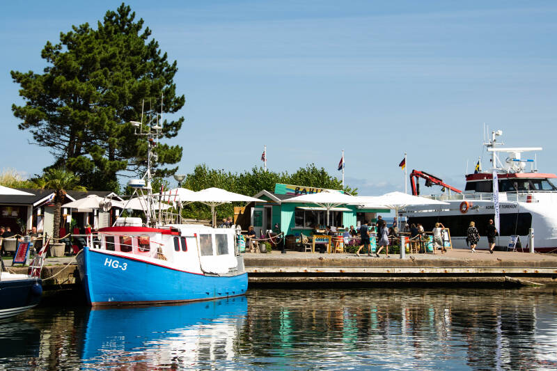 Na deze leuke tussenstop, op een warme zondagochtend, rijden we naar camperplaats Gronhogen. En inderdaad, een mooie , maar drukbezochte camperplaats. We hebben geluk en staan op de eerste rij. We kijken richting de zee. erg mooi. Het dorp blijkt ook leuk, pittoresk met kleine kleurige haven, cafe annex galerie.