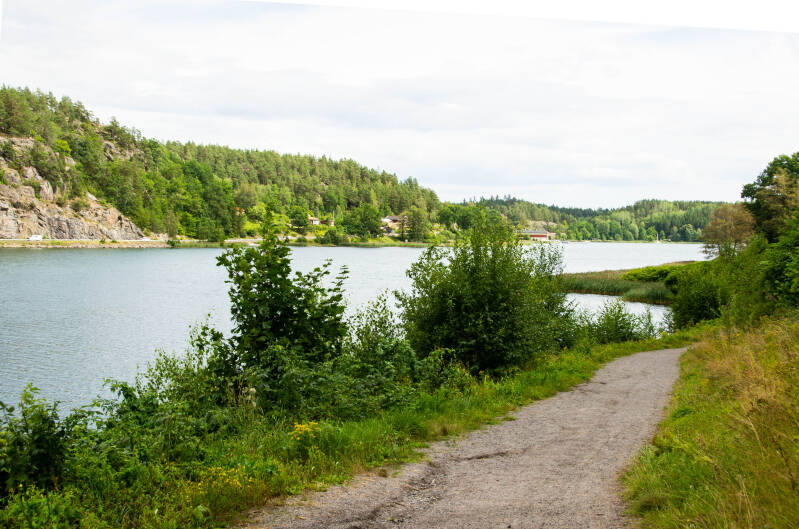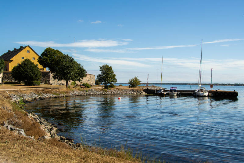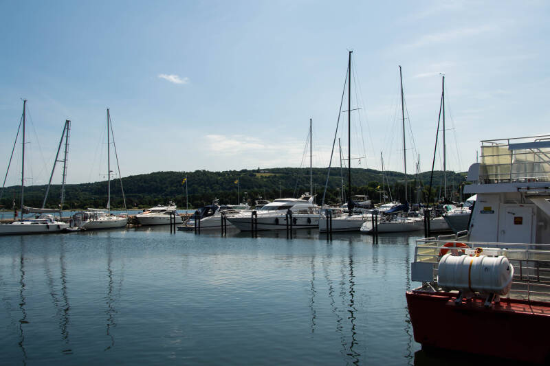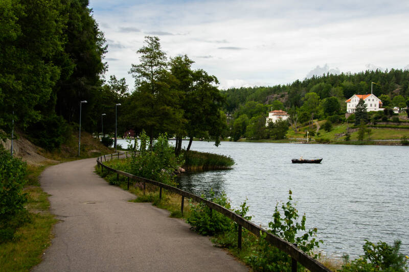 Vanaf de camping ontdekken we een strandpromenade die langs het haventje door het bos naar de stad Karlshamn gaat. Dat blijkt een bijzonder mooie omgeving te zijn.