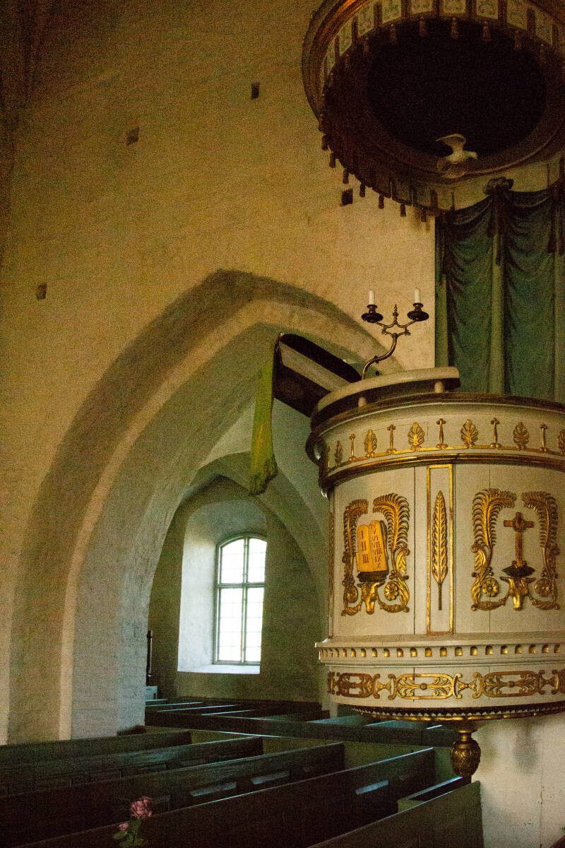 Kenmerkende kerk van Bastad met de roodwitte kleuren en bijzondere toren met trapgevel. Rechts de preekstoel en gewelf.