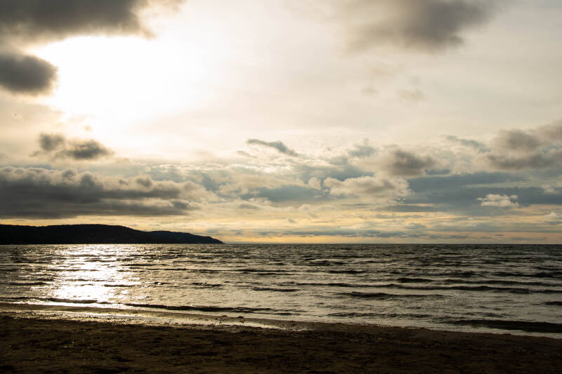 Het Vanernmeer bedekt door witte wolken en de haven van Lidkoping.