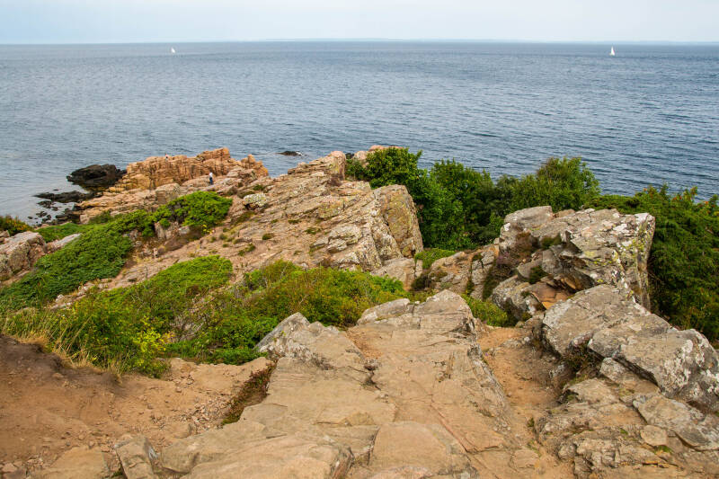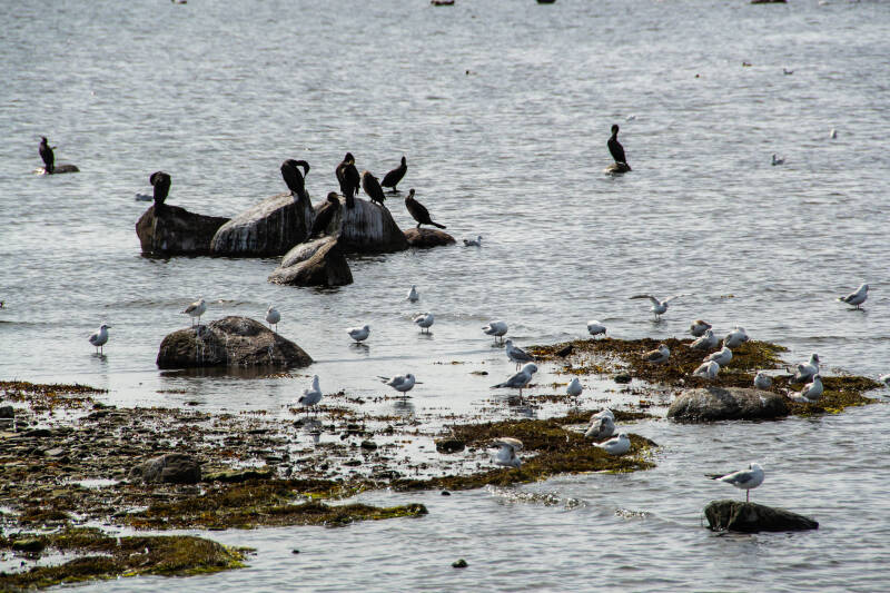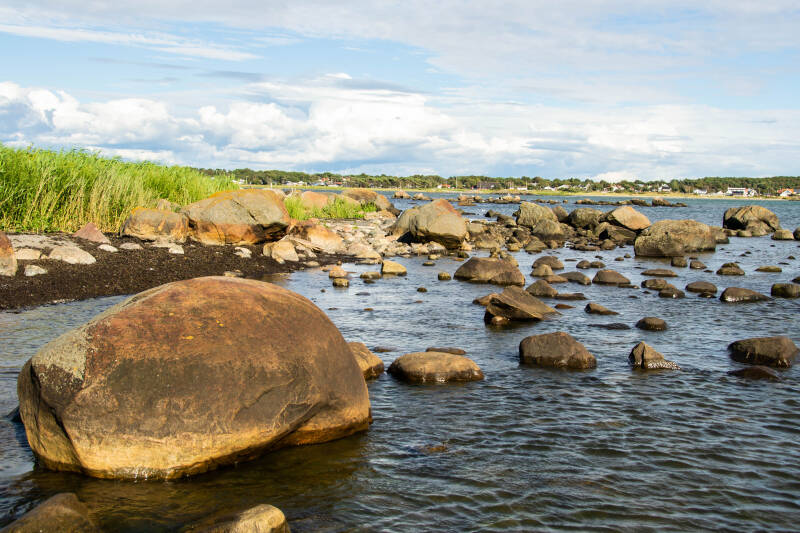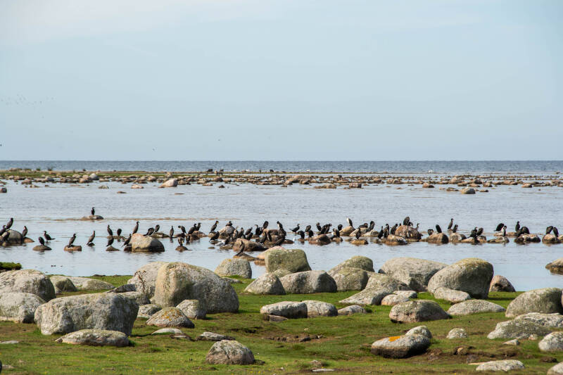 Langs de kust van Bastad liggen in zee vele rotsblokken waar vogels, bv aalscholvers, genieten van de zon.