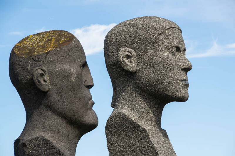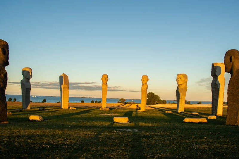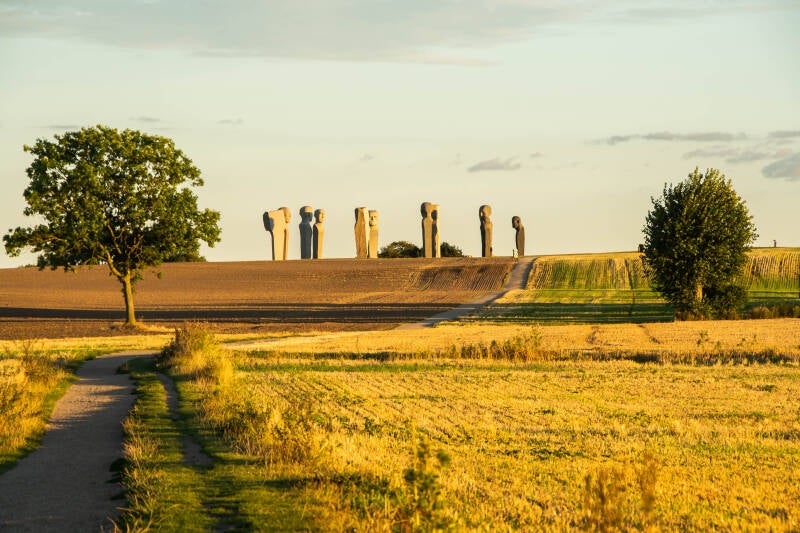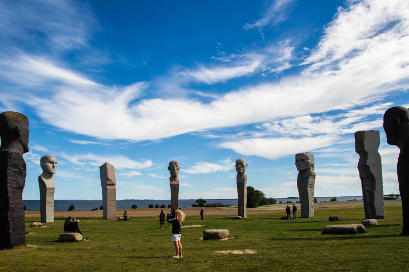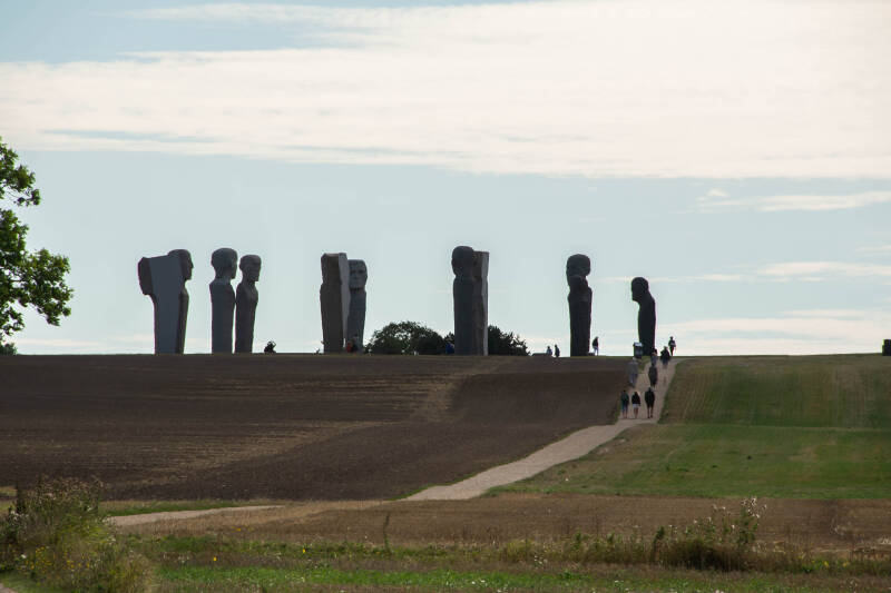Wanneer we op weg gaan naar Kragenaes blijkt dat het stadje eindigt bij de overzetpont. Deze kan je vervoeren naar twee dichtbij liggende eilandjes Fejo en Femo. We zoeken even naar de start van de wandeling om de beeldengroep te bereiken. We gokken erop dat onze hondjes allemaal mee kunnen en dat het niet te lang of te zwaar zal zijn. dat blijkt gelukkig niet het geval. De wandeling gaat door het boes en door de graanvelden en als vanzelf bereik je de beeldengroep: de Dodekalitten. Het is een beeldengroep van 12 beelden, elk tussen de 7-9 meter hoog met daarop een hoofd van ongeveer 2 meter. De beelden staan in een cirkel. Ook wordt er, afhankelijk van de zonsopgang en - ondergang muziek bij afgespeeld. het is een indrukwekkend gegeven in een landelijk gebied. Het doet denken aan Stonehenge en Paaseiland. Het is een van de grootste kunstwerken in Denemarken. Sommige beelden lijken nog niet af te zijn.