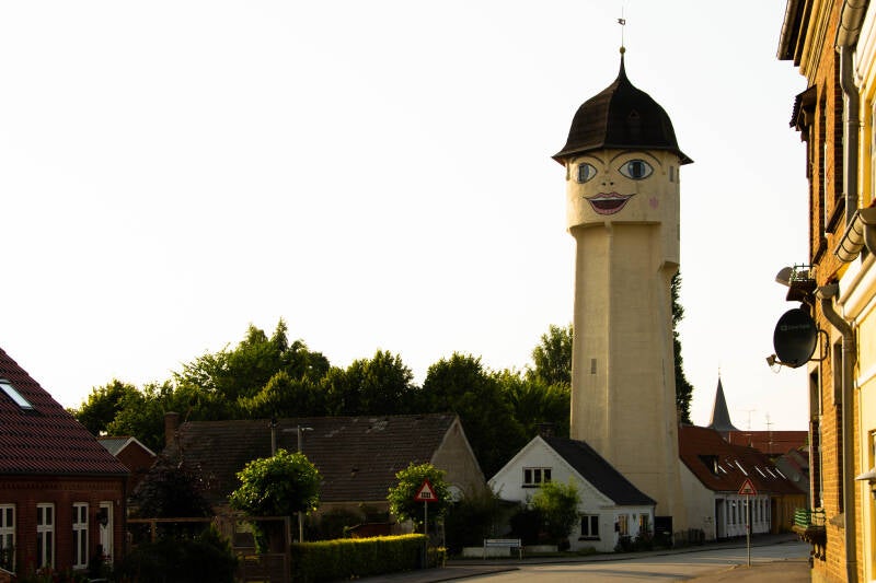 De camping in Sakskobing is een stadscamping die goed gevuld is maar toch een mooi plekje voor ons heeft. Vanwege de enorme warmte zullen we ons warmtedoek ook installeren. Het mooie van deze camping is dat het op korte afstand ligt van het centrum, van een stadspark(handig voor het uitlaten van de honden) en van de fjord. Sakskobing is een klein charmant stadje met een opvallende watertoren met 2 gezichten.