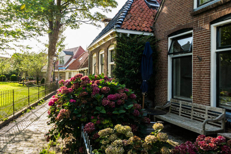 De kleurige hortensias geven dit hoekje bij de kerk een fijne sfeer.