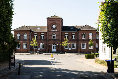 Bogense heeft een opvallend stadhuis met daarbij een beeld van een moeder die haar kind vasthoudt. Rechts het museum van Bogense.