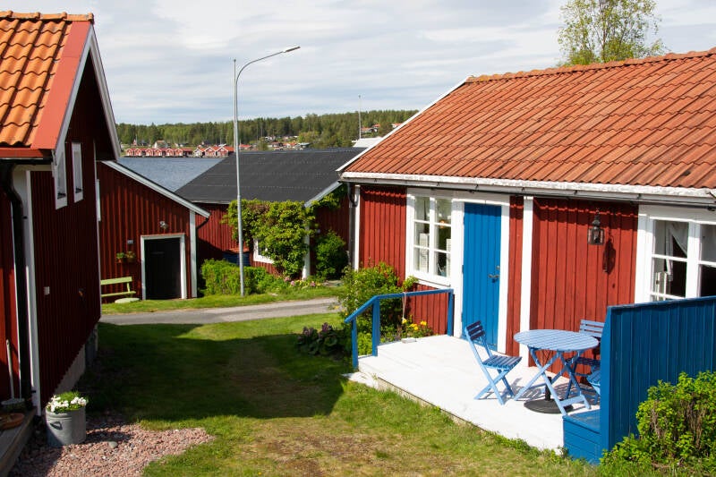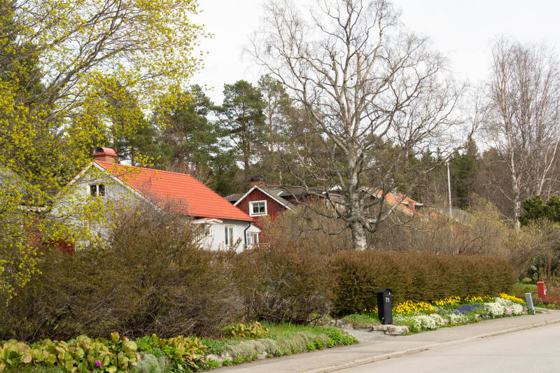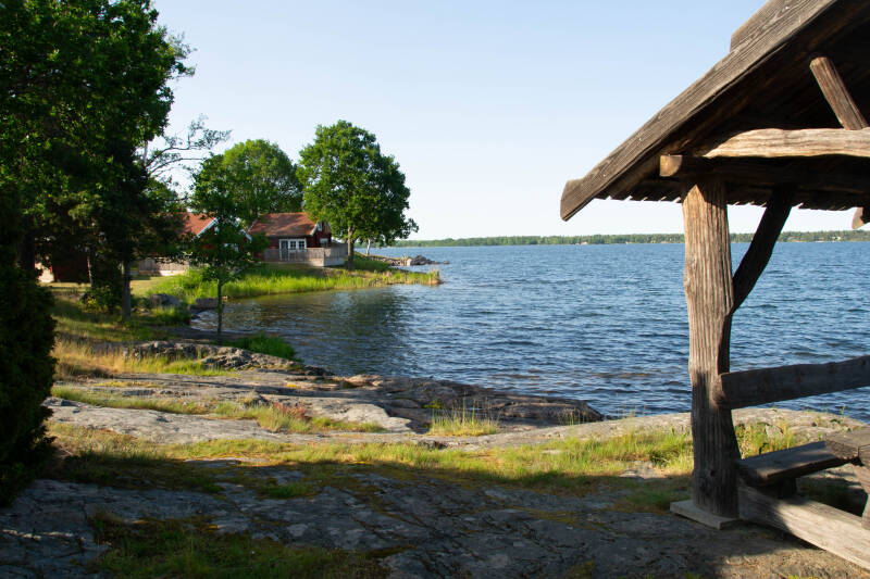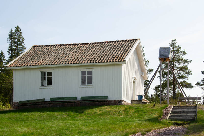 Na deze wandeling in het nationale park rijden we verder naar Norrfossviken, een klein schilderachtig vissersdorp, 350 jaar oud. Het blijkt nog een flinke autorit met bergen en dalen en bochten. Het hele dorp ademt visserij zelfs in de tuin wordt je eraan herinnerd. Op een heuvel treffen we een klein wit kerkje met klokkenstoel.