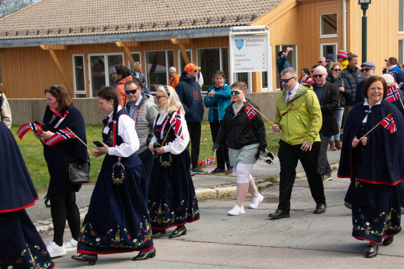 We zijn nieuwsgierig naar Reine. Daarvoor moeten een kleine 5 kilometer terugfietsen, heuvelachtig, door een tunnel. Maar het gaat goed. Reine is een schilderachtig plaatsje aan het fjord omringd door bergen. Op de dag dat we er zijn is het onafhankelijkheidsdag, een nationale feestdag. Ook in Reine wordt het gevierd met een optocht door het dorp in klederdracht en met muziek.