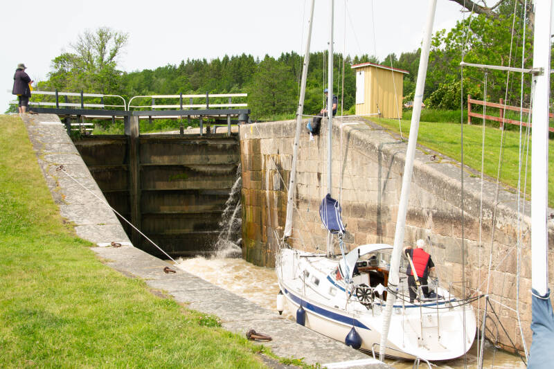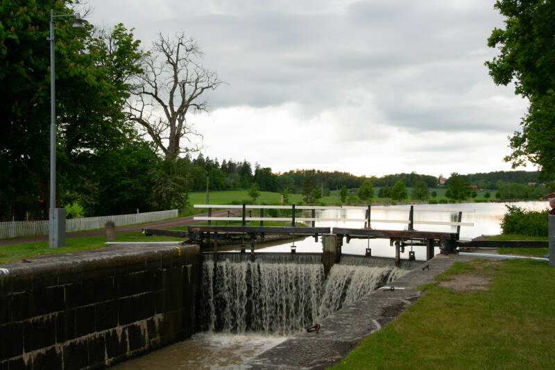 Het is vandaag zondag , eerste Pinksterdag wanneer we koers zetten naar Soderkoping. Een rit van 188 kilometer verder zuidwaarts. Soderkoping ligt aan het beroemde Gotakanaal. Dit kanaal loopt van oost naar west, dwars door Zweden. Het is beroemd om zijn vele sluizen en sluisjes en groot verval. Langs het kanaal is een fietspad. Het is zonnig weer. De rit verloopt voorspoedig. Onze camping bereiken we na een flinke afdaling. De camping, Skeppsdockan, ligt direct aan het Gotakanaal. De camping is ook bijzonder omdat de camping is opgezet rondom een scheepswrak wat is een dok ligt. Heel apart.