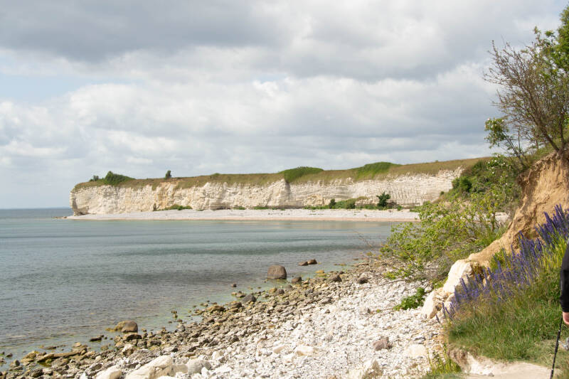 Wanneer we weer verder gaan hebben we een rit voor de boeg van 280km en we gaan op weg naar Denemarken. Het waait flink maar de reis verloopt vlot zodat we rond 14.00u arriveren op Hundige Strandcamping in Greven. Best aardige camping , maar veel te duur € 62,00 per nacht, We vertrekken de volgende dag en rijden voorbij Koge. We kiezen voor camping Feriebyuens in Rodvig. De camping ligt op loopafstand van het strand. Echter daarvoor moet je flink de trap of de rotsen af. Wanneer ik met de hondjes op het strand loop word ik aangesproken dat de honden niet los mogen lopen. Dus aangelijnd verder. Rodvig is een leuk havenplaatsje waar de huizen hoog staan vanwege de rotsen. Deze camping ligt ook in de buurt van Stevens Klint een prachtige plek bij de krijtrotsen.