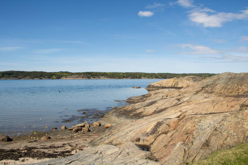 Vannacht heeft het flink geregend. Maar als we gaan rijden is het droog. We gaan naar Vastervik resort. We kennen het en gaan er graag weer naar toe. Het is een enorm natuurgebied waarin gekampeerd kan worden met bos en eilandjes. Het resort is groot en bied veel maar is ook duur: € 60,00 per nacht. Maar wij vinden het de camping waard. Je hoeft eigenlijk het resort niet af. Wij krijgen een mooie plek met uitzicht op het fjord.